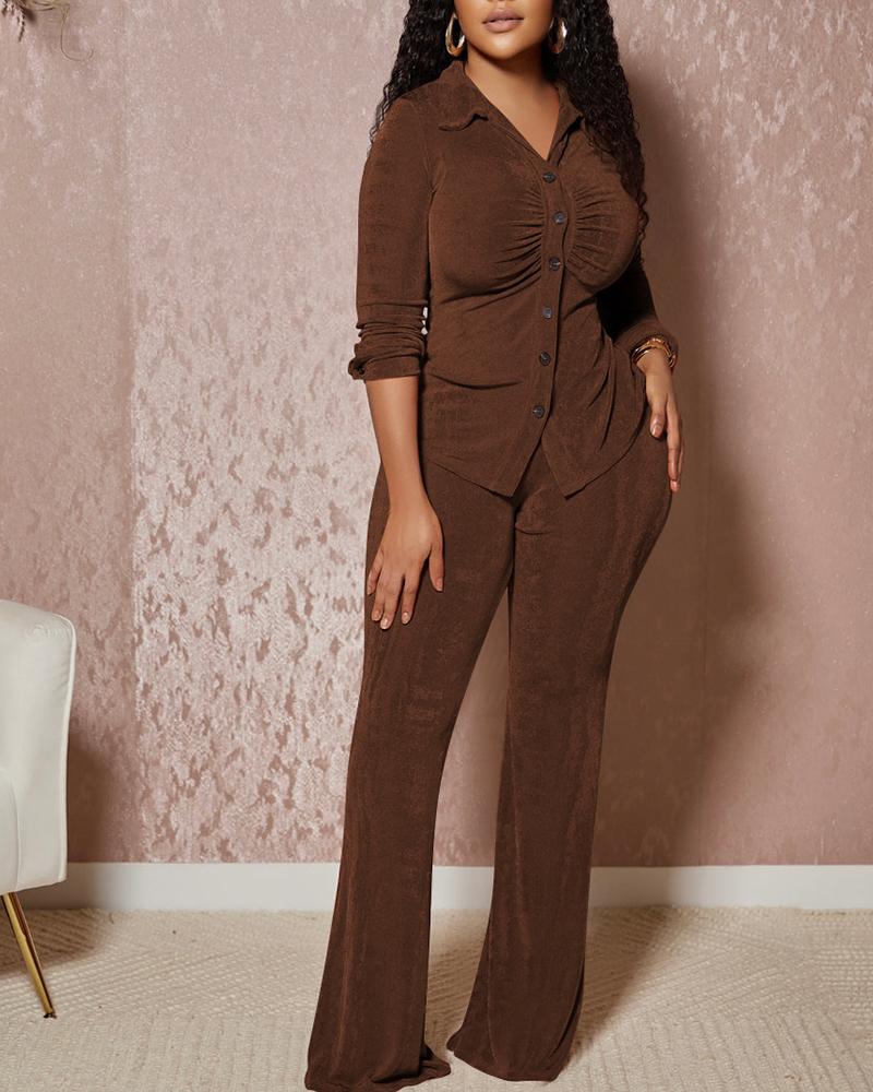Velvet Ruched Buttoned Shirt & Bootcut Pants Set, Brown