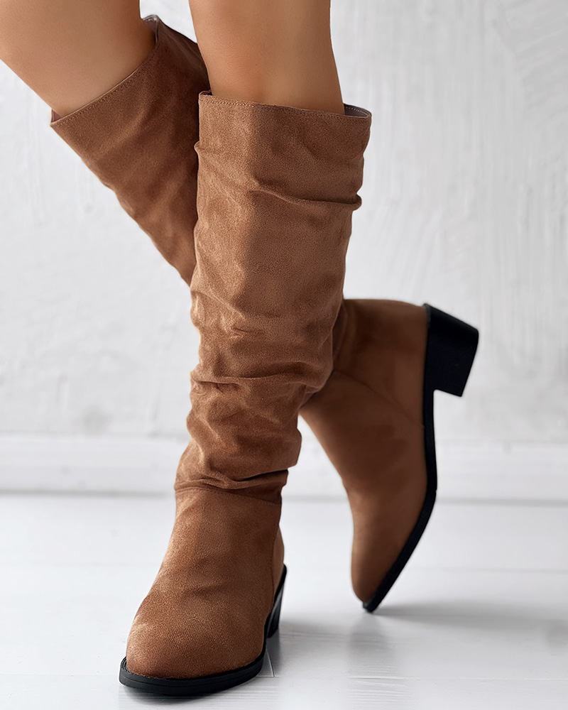 Velvet Ruched Point Toe Long Boots, Brown