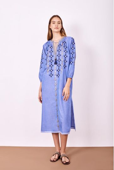Vestido evassée midi, con bordado a contratono en el frente y las mangas. El cuello es mao y en v, que puede cerrarse con cordones a tono, terminados en pompones con mostacillas. Tiene detalles de lentejuelas plateadas y bordados en punto cruz que acentúan el espíritu artesanal de la prenda.