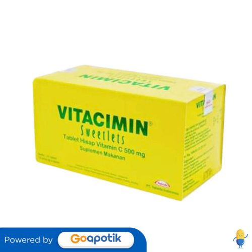 Deskripsi : Vitacimin merupakan tablet hisap yang dapat digunakan untuk Pencegahan dan mengatasi defisiensi vitamin C. | Komposisi : Tiap tablet mengandung asam askorbat 250 mg dan Na askorbat 281,25 mg (setara asam askorbat 250 mg). | Dosis : 1-2 tablet sehari, dihisap perlahan-lahan. | Indikasi : Pencegahan dan mengatasi defisiensi vitamin C. | Perhatian Khusus : NA | Kemasan : DUS, 10 STRIP @ 2 TABLET HISAP | NIE : SD021501851