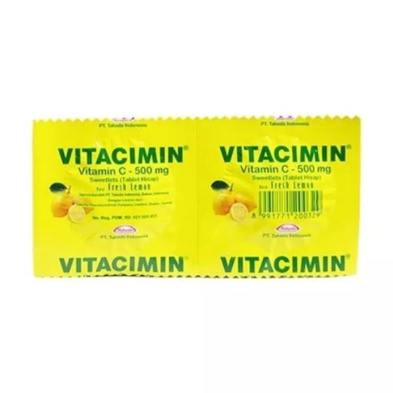 Vitacimin merupakan vitamin C berbentuk tablet hisap yang diformulasi untuk membantu memenuhi kebutuhan vitamin C. Dibuat dengan rasa segar yang pasti banyak disukai. Hadir dalam kemasan strip praktis yang terdiri dari 2 tablet yang mudah dibawa kemana-mana.