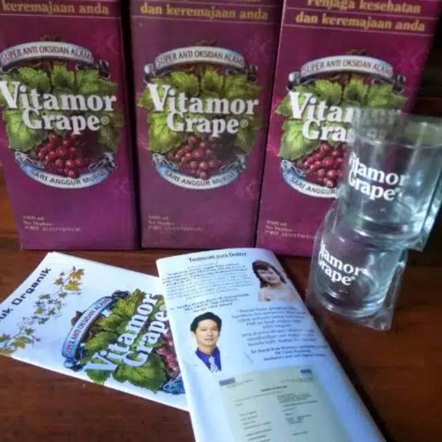 Product Details: Vitamor Grape adalah minuman kesehatan yang mengandung anti oksidan alami karena terbuat dari anggur hitam asli tanpa pengawet dan pewarna. Vitamor grape aman untuk dikonsumsi oleh semua orang, termasuk orang yang menderita diabetes karena tidak mengandung pemanis buatan. Rasa manis yang ada di dalam minuman ini asli berasal dari buah anggur sendiri. Beberapa manfaat dari Vitamor Grape : a. Sebagai antioksidan yang sangat kuat, kandungan bioflanoid dalam anggur dapat mencegah oksidasi LDL (kolestrol jahat) 50 kali lebih kuat dari vitamin E dan 20 kali lebih kuat dari vitamin C. b. Kandungan flavonoid yang terdapat di dalam anggur, dapat merawat dan membersihkan pembuluh darah dari penyumbatan sehingga terlindungi dari resiko stroke, hipertensi, dan serangan penyakit jantung koroner. c. Sarana detoks untuk menggelontorkan toksin... Buah anggur juga mengandung enzim yang bersifat penggiat fungsi empedu yang akan meningkatkan efisiensi pengubahan lemak menjadi asam empedu, kemudian dibuang keluar tubuh. hal ini tentunya akan mencegah terjadinya lonjakan kadar lemak darah. sehingga Vitamor sangat bagus bagi para pengiap hipertensi serta yang kadar kolestrol dan trigliserida darahnya tinggi. d. Membantu menurunkan berat badan. Kandungan magnesium yang terdapat dalam anggur dapat menggiatkan fungsi sistem pencernaan. e. Untuk Anti Aging dan mengatasi gangguan prostat f. Mencegah kanker. Vitamor Grape dikemas dalam ukuran 1 Liter. Anjuran penggunaan Vitamor Grape adalah 1 satu sloki di pagi hari (30 menit sebelum sarapan) dan 1 sloki di malam hari sebelum tidur. Untuk dosis pemulihan, dapat ditingkatkan menjadi 2 sloki di pagi dan malam hari. Setiap pembelian Vitamor Grape, akan dilengkapi dengan 1 buah sloki.