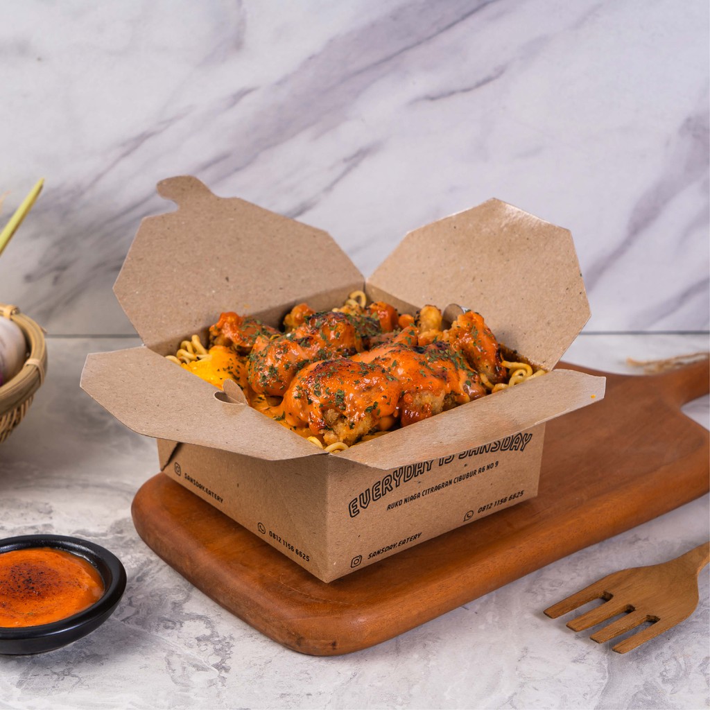Nasi yang dilengkapi dengan omelette dan ayam krispi dengan saus mentai