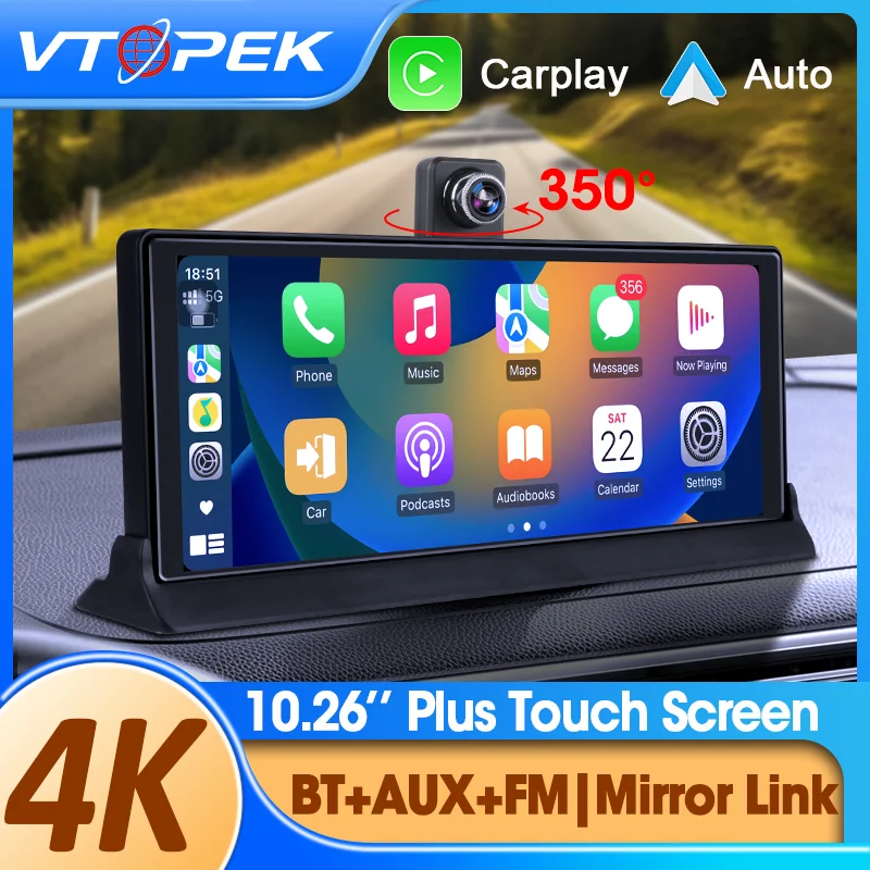 Vtopek 10.26" Car DVR 4K 350° Rotatable Front Camera Carplay Android Auto Ai Screen Dash Cam Video Recorder GPS Navigation BT FM