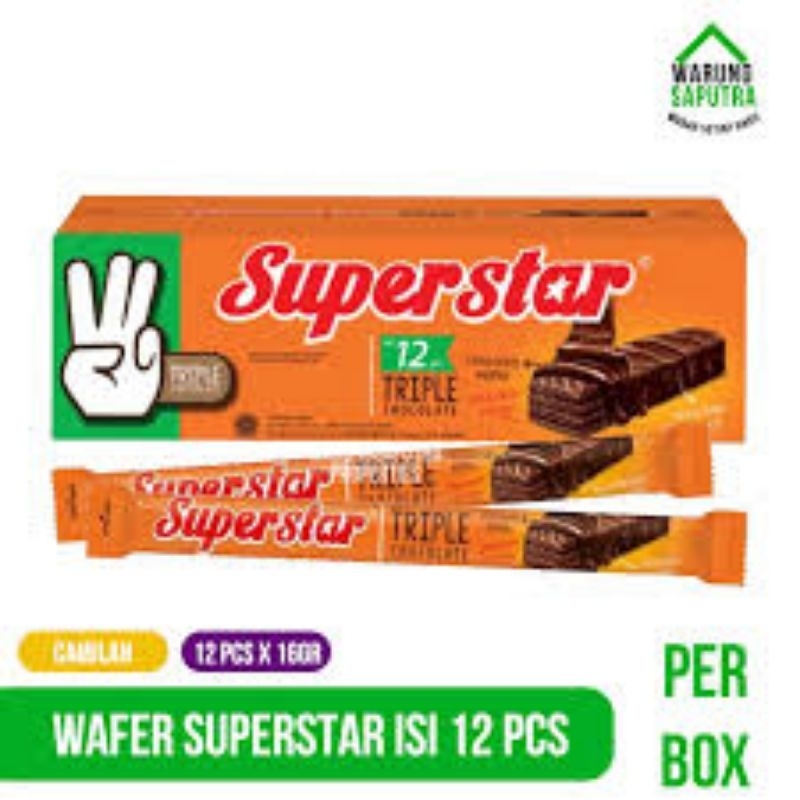 Superstar triple chocolate isi 12, wafer rasa cokelat. Chocolate wafer, chocolate cream, chocolate coated. Komposisi : Tepung trigu, gula ...