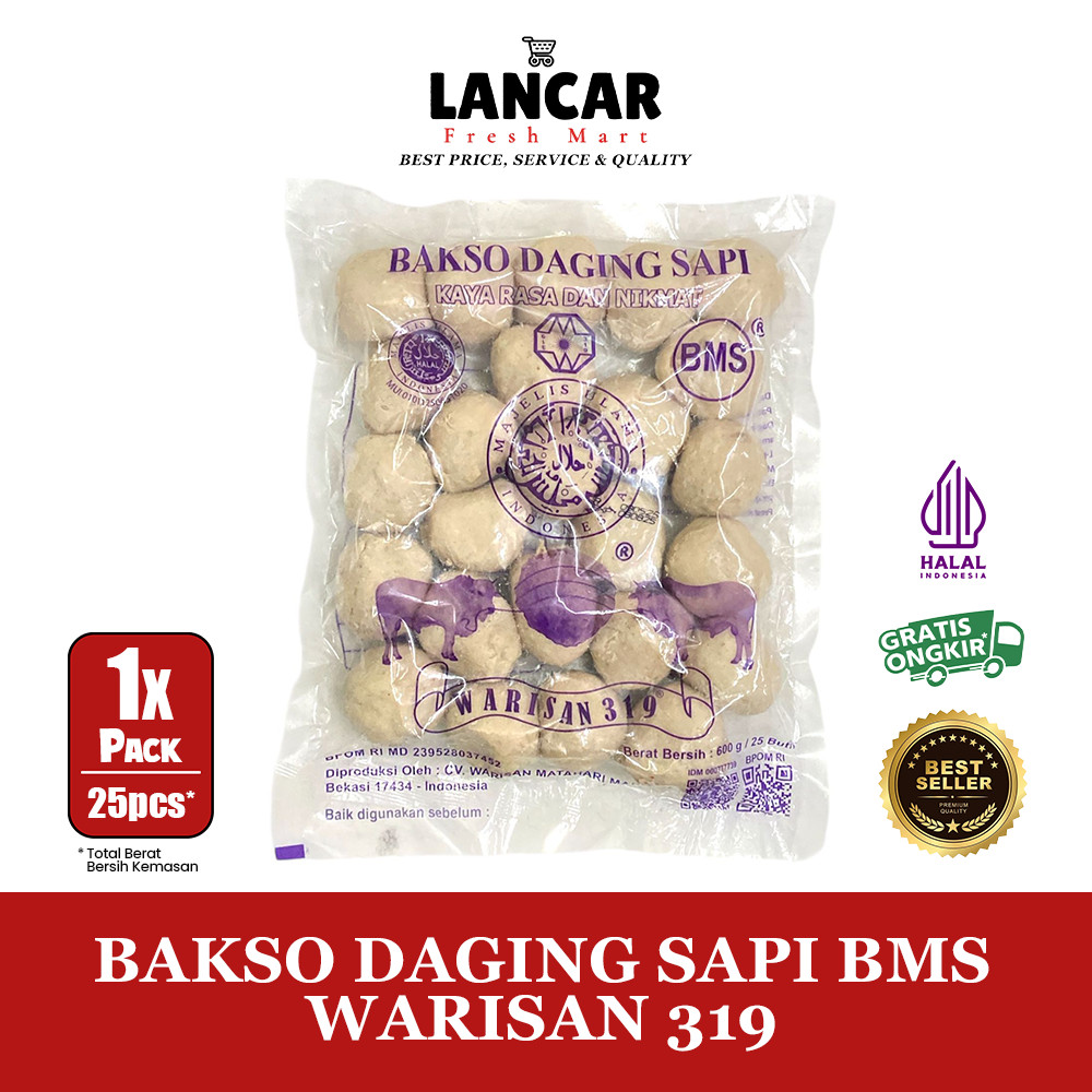 Warisan 319 Bakso Sapi BMS adalah bakso premium yang dibuat dari daging sapi pilihan dengan kualitas lebih tinggi, menghadirkan cita rasa daging yang lebih kuat, tekstur padat, dan rasa gurih alami tanpa rasa tepung yang mendominasi. Varian BMS (Baso Mutu Spesial) ini hadir dalam ukuran besar dan isi 25 butir per kemasan, cocok untuk penyajian spesial di rumah atau usaha kuliner yang mengutamakan kualitas.
