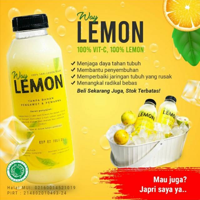 Way Lemon adalah Minuman Sari Lemon murni tanpa pengawet dan pewarna. Tentunya dapat meningkatkan imunitas tubuh. 100 % vitamin C 100% Lemon.