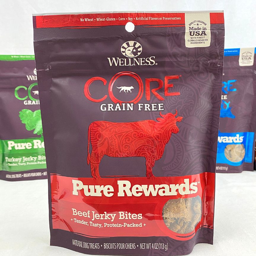 DescriptionWellness CORE Pure Rewards Grain-Free Beef Jerky Bites are a hearty lean snackmade with real beef. This yummy treat is free from meat by-products, artificialcolors and artificial flavors. With a bold natural taste and big on nutritionpups all around give Wellness Jerky Bites two paws up! Each tender nuggetcontains minimal ingredients and is packed with protein, perfect for training.Key Benefits * All natural ingredients with no wheat, wheat-gluten, corn, soy, artificial colors or flavors * Treats are high in iron, calcium, zinc and vitamin A for optimal health * Made from real beef and does not contain any meat by- products * Quality assured and made from finest globally-sourced ingredients * Ideal for training with only 5 calories per treatIngredientsBeef, Dried Chicory Root, Lecithin, Salt, Dried Cultured Whey Product, MixedTocopherols added to preserve freshness, Rosemary Extract, Green Tea ExtractSpearmint Extract.Guaranteed AnalysisCRUDE PROTEIN23.0% minCRUDE FAT38.0% minCRUDE FIBER2.0% maxMOISTURE20.0% max