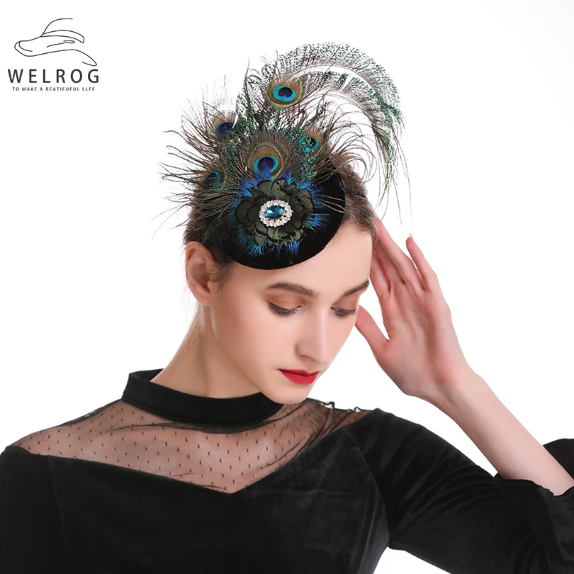 WELROG натуральное павлинье перо вуалетки Ретро Красочные Стразы инкрустированные маленький берет Чай Вечерние головные уборы одежда бархатный вуалет
