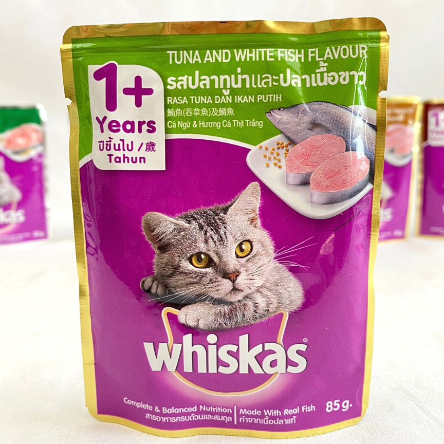 Whiskas Pouch Tuna & White Fish 85grComplete and Balanced Nutrition – Made From Real Chicken & FishSealed inFreshness.WHISKAS® Pouch is made from real fish, gently cooked to perfection to bring outthe very best in taste in a convenient single serve format. It is steam cookedand sealed in foil pack to ensure freshness, taste and appetizing aroma in everymeal for your cat.WHISKAS®Pouch is also nutritionally complete and balanced for healthy cats withbeautiful skin and coat.IngredientsContainsTuna red meat, white fish, gelling agents, soy bean oil,vitamins and minerals.Nutritional AnalysisProtein - 9%, Fat - 2%, Fibre - 1% &Moisture - 87%