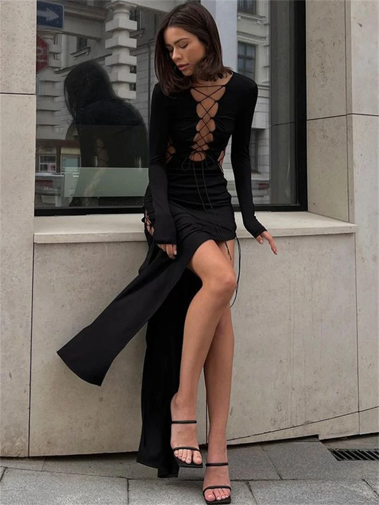 WJFZQM облегающее Макси-Платье на шнуровке с круглым вырезом и длинным рукавом с Боковым Разрезом, Женская Осенняя сексуальная одежда Y2K, платья для клуба