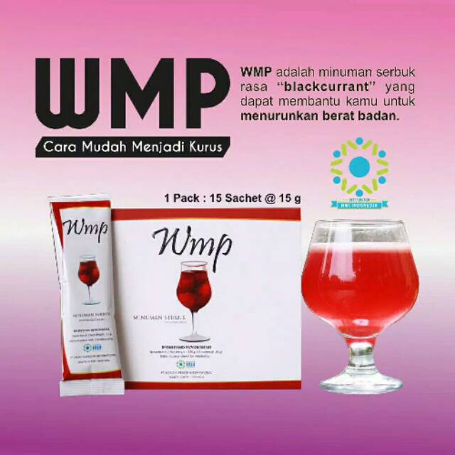 WMP - Weight Management Program adalah minuman serbuk dalam kemasan sachet yang mengandung kopi hijau dan beberapa bahan alami lainnya serta dikombinasikan dengan vitamin dan mineral dengan rasa blackcurrant, bekerja sinergis dalam meningkatkan pembakaran lemak tubuh (metabolism booster) sehingga penurunan berat badan menjadi lebih efektif.