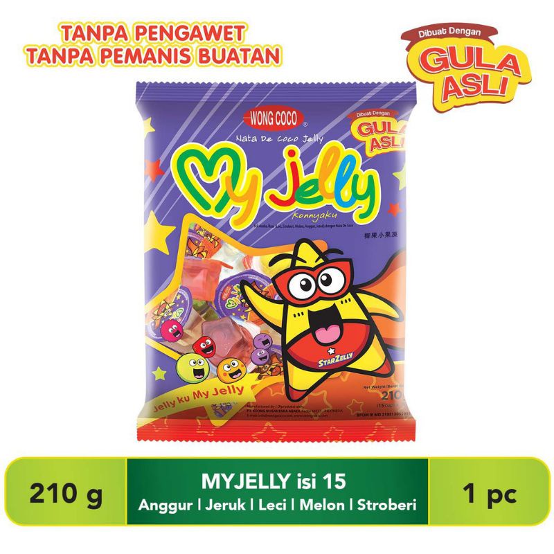 My Jelly Wong Coco merupakan cemilan favorit anak-anak yang terbuat dari rumput laut, diproduksi dengan menggunakan 100% gula asli tanpa pemanis buatan dan tidak menggunakan bahan pengawet. Jelly Wong Coco tidak menggunakan pengawet dikarenakan Jelly diproses sterilisasi dengan suhu tinggi.