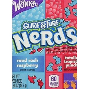 Double the deliciousness and double the fun with these flavors, Tropical Punch and Road Rash Raspberry. You'll be the hippest nerd on the block with this box of nerds! Specifically formulated for extreme sports pros, the packages feature silhouetted images of surfers and skate boarders (thus the Surf & Turf product name).