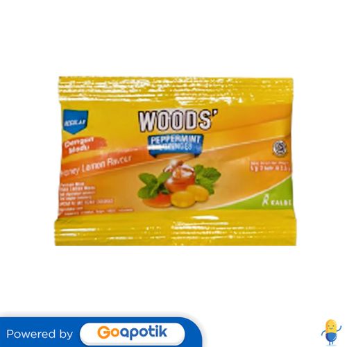 Deskripsi : WOODS TABLET HISAP PEPPERMINT RASA HONEY LEMON merupakan permen dengan campuran rasa madu dan lemon yang dapat memberikan sensasi melegakan tenggorokan dan sensasi menyegarkan pernafasan. | Komposisi : Gula, sirup glukosa, minyak Atsiri Peppermint, peppermint verona, mentol kristal, perisa identik alami lemon, pengatur keasaman asam sitrat, minyak atsiri adas manis, dan trans-aneto | Dosis : Gunakan sesuai kebutuhan | Indikasi : Digunakan untuk memberikan sensasi melegakan tenggorokan dan sensasi menyegarkan pernafasan | Perhatian Khusus : - | Kemasan : Aluminium Foil, 2 butir @ 2,5g | NIE : MD 624410059005