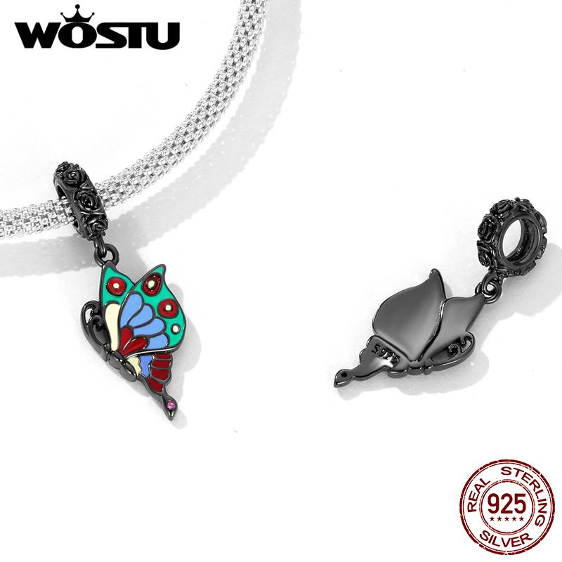 WOSTU Стерлингового Серебра 925 пробы Черное Золото Красочные Розы Бабочка Подвеска Животное Шарм Бусины Подходит Оригинальный DIY Браслет Ювелирные Изделия 925 silver