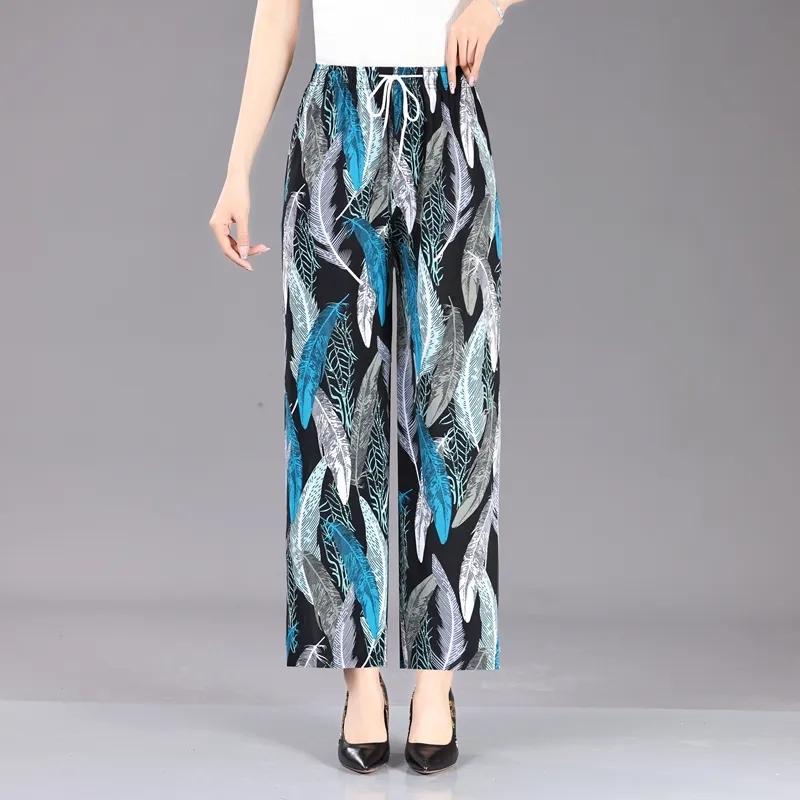 WTEMPO Весна, лето, осень, свободные широкие брюки, женские эластичные брюки-кюлоты с высокой талией и принтом, большие размеры, девять точек, танцевальные брюки с цветочным принтом 4XL синий