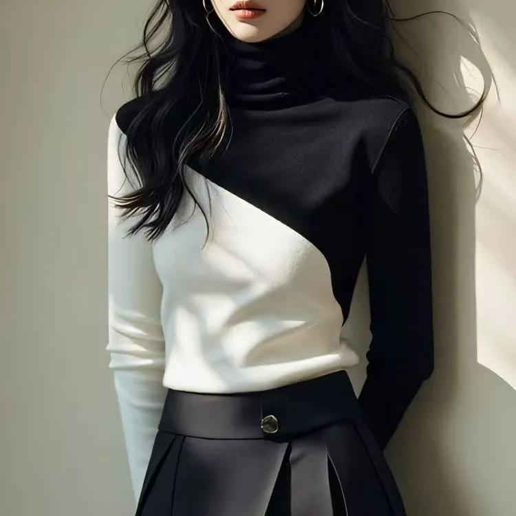 WTEMPO Женская футболка с длинным рукавом, контрастных цветов, черная и белая, осенне-зимняя, повседневная, с высоким воротником, облегающая, топы M чёрный