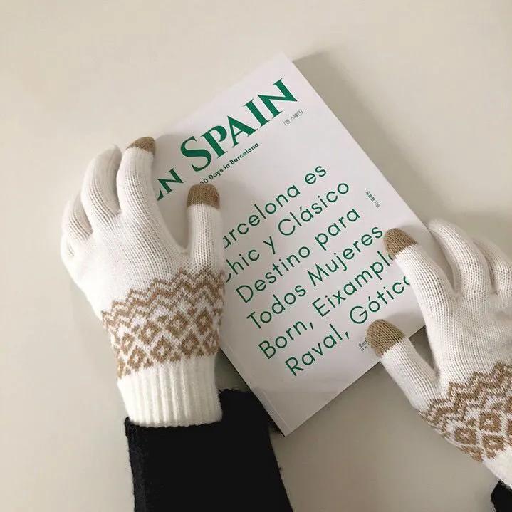 WTEMPO Осень-зима однотонные жаккардовые вязаные перчатки с полным пальцем женские универсальные повседневные эластичные шерстяные перчатки 1 pair белый