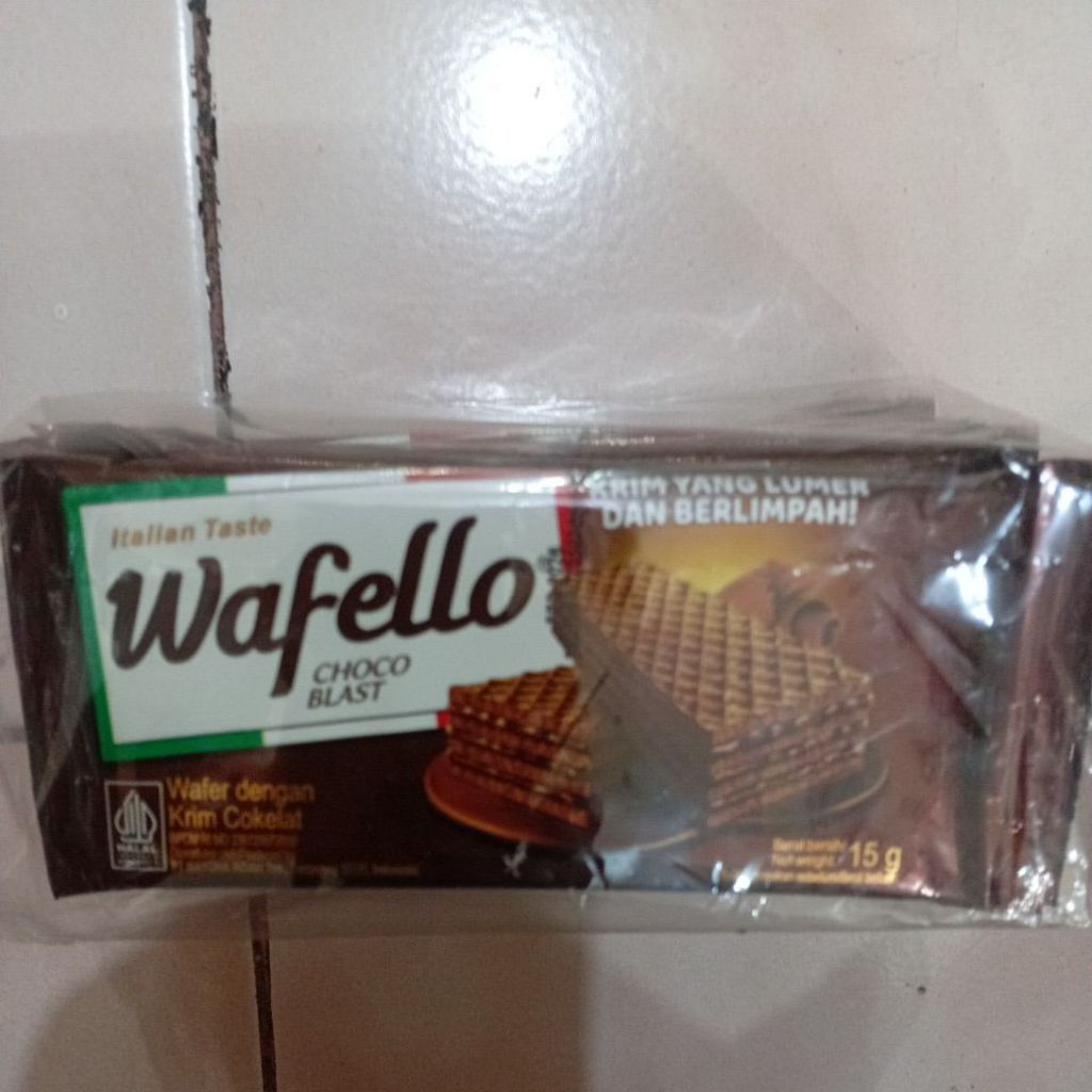 wafello choco blast isi 10 sachet @17gr wafer krim coklat yang karamelnya terlalu enak untuk di lupakan.
