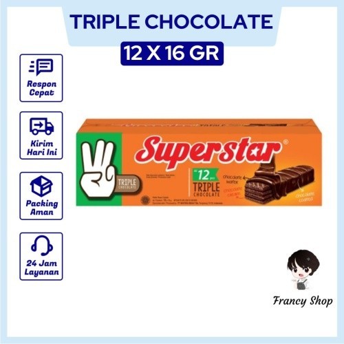 Superstar chocolate ini merupakan wafer stick renyah yang memiliki kemurniaan, kelembutan, dan kesempurnaan rasa. Wafer stick ini terdiri dari kombinasi wafer krispi, krim cokelat premium yang nikmat, dan susu lezat di setiap gigitannya, memberikan sensasi menikmati coklat premium yang tak terlupakan. Diproduksi dengan teknologi modern dengan bahan-bahan berkualitas, sehingga menghasilkan wafer stick sebagai camilan yang pas dan bermutu baik.
