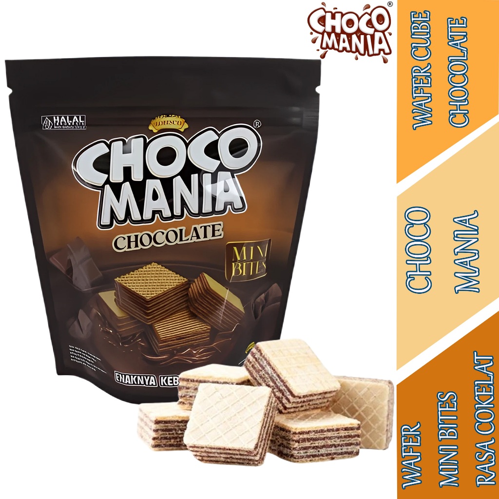 Choco mania adalah camilan ringan berbentuk potongan wafer kecil (mini bites) berbentuk kubus, yang dilapisi atau diisi dengan krim cokelat lezat. Produk ini memiliki tekstur yang renyah di luar dan lembut manis di dalam, menjadikannya pilihan camilan praktis yang disukai berbagai kalangan, dari anak-anak hingga orang dewasa.