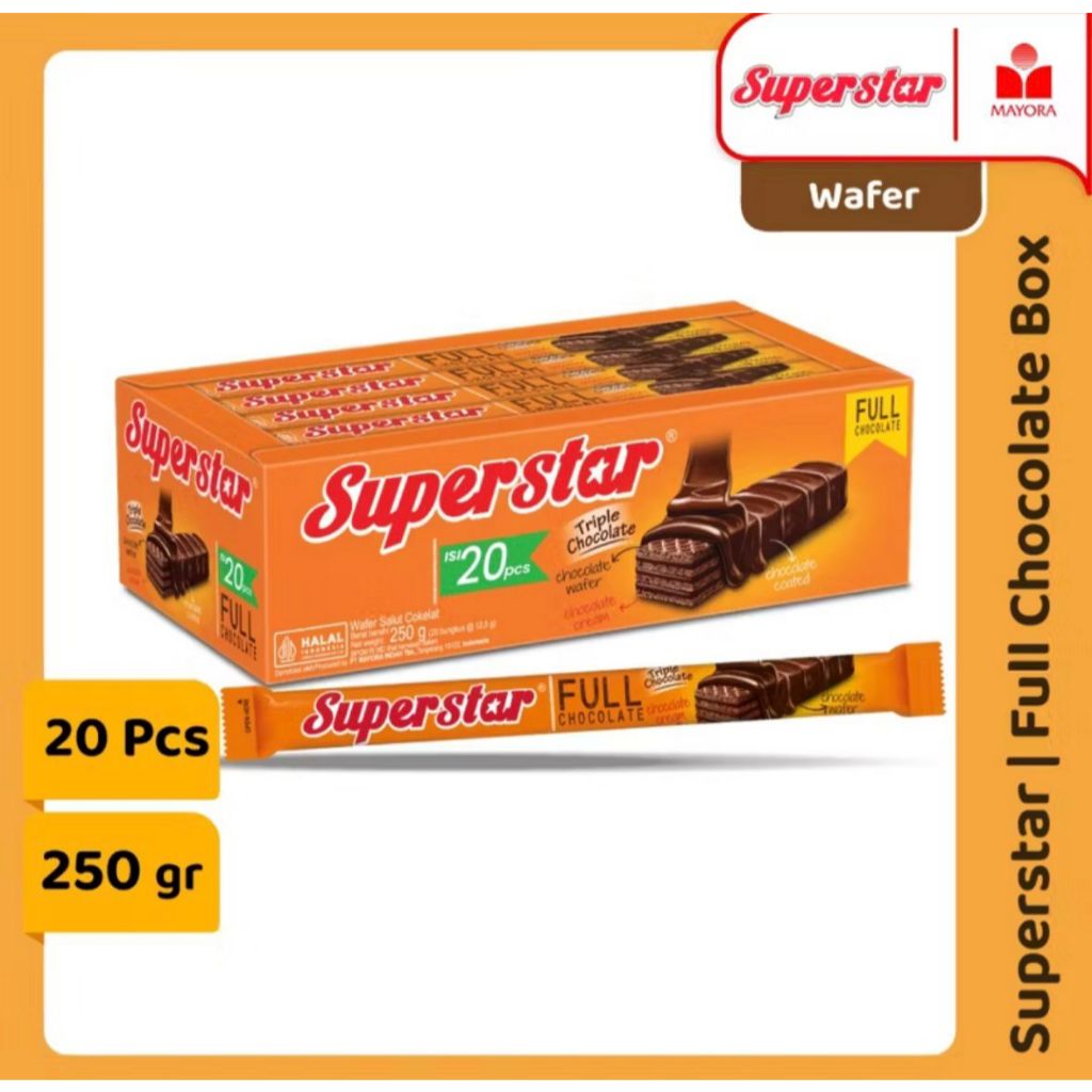 Wafer Superstar Full Chocolate Box merupakan wafer renyah, enak dan ringan yang full cokelat luar dan dalam. Rasa cokelat berkualitas yang hadir dalam 3 lapisan krim cokelat lezat dijamin dapat mengembalikan mood Anda menjadi Happy seharian. Wafer Cokelat dari Mayora ini praktis untuk dibawa kemana saja, diwaktu santai maupun ketika menemani aktifitas padat Anda sehari-hari. Ditambah lagi, Camilan yang banyak disukai anak-anak hingga orang dewasa ini juga cocok untuk dijadikan hadiah untuk teman atau dinikmati dengan segelas teh saat berkumpul bersama keluarga.