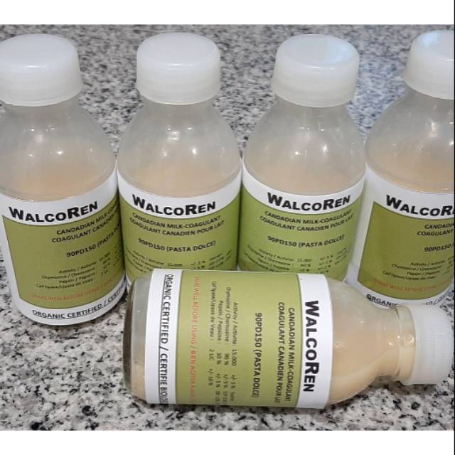 - keju lunak: 2,5 ml (1/2 sdt) utk 8 liter susu