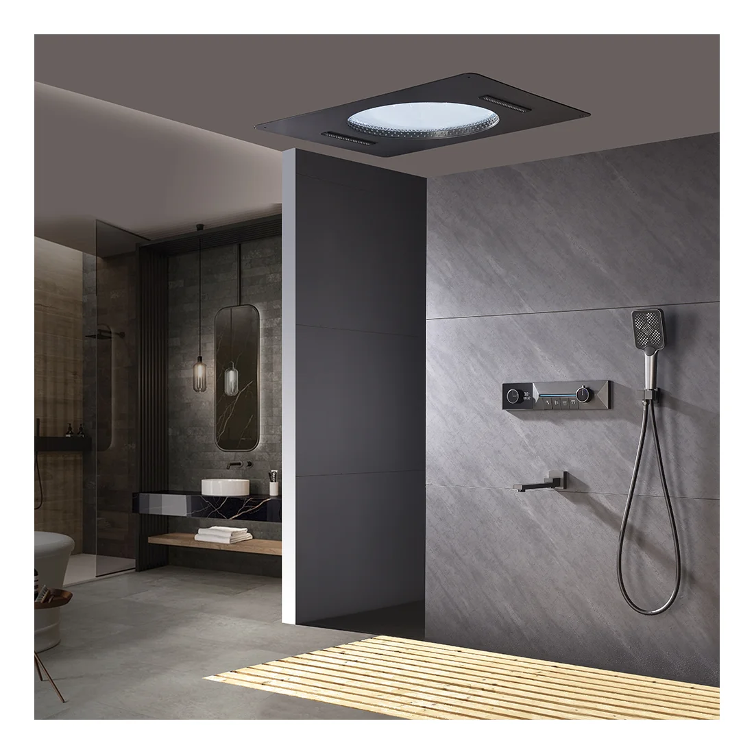 Wall Mount Concealed Top LED Shower Head Digital Display Smart Shower System 4 Function Thermostatic Shower Complete Set
