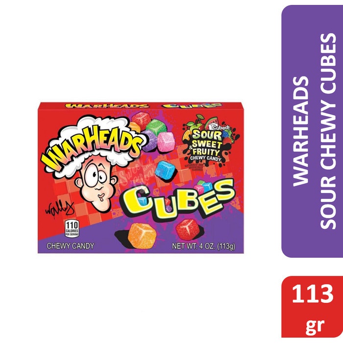 Warheads Sour Chewy Cubes adalah Permen unik yang kenyal berbentuk kubus mempunyai rasa yang unik, tidak terlalu asam ... tidak terlalu manis! dengan isi berbagai macam rasa yaitu: