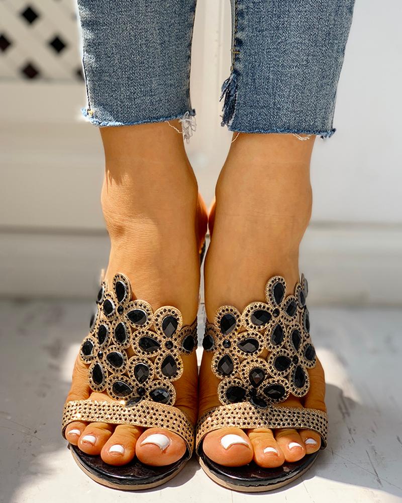 Waterdrop Rhinestone Chunky Heeled Sandals, Black