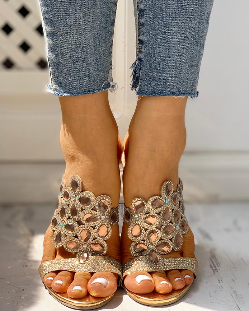Waterdrop Rhinestone Chunky Heeled Sandals, Gold