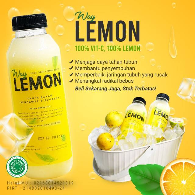 Way Lemon adalah minuman sari lemon murni tanpa pengawet dan pewarna. Tentunya dapat meningkatkan imunitas tubuh. 100 % vitamin c 100% Lemon. Apa saja kegunaan dari Way Lemon ini?