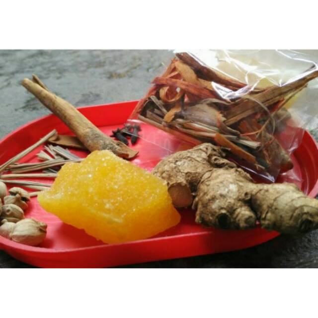 Kayu secang, cengkeh, kapulaga, kayu manis, sereh, jahe, dan gula batu.