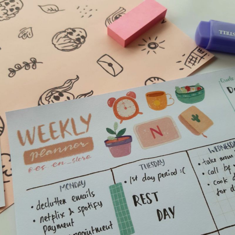 Satu paket weekly planner ini terdiri dari 6 minggu. Weekly planner ini cocok buat kamu yg suka merencanakan kegiatan kamu, atau buat kamu yg baru belajar menggunakan planner ❤️