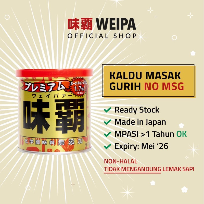 Weipa adalah kaldu penyedap nomor satu di Jepang yang sudah lama jadi favorit ibu rumah tangga. Weipa mengandung ekstrak alami daging babi, ayam dan sayur-sayuran.
