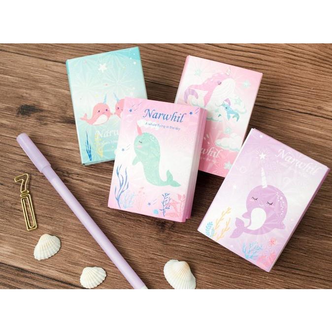 Berbeda dengan teman-temannya, Narwhil, si paus narwhal ini tidak tinggal di laut tetapi di langit! Koleksi Whale in the Sky Sticky Notes Set menghadirkan catatan tempel berbagai bentuk dalam warna-warna pastel yang indah, tentunya dengan ditemani si paus bertanduk.