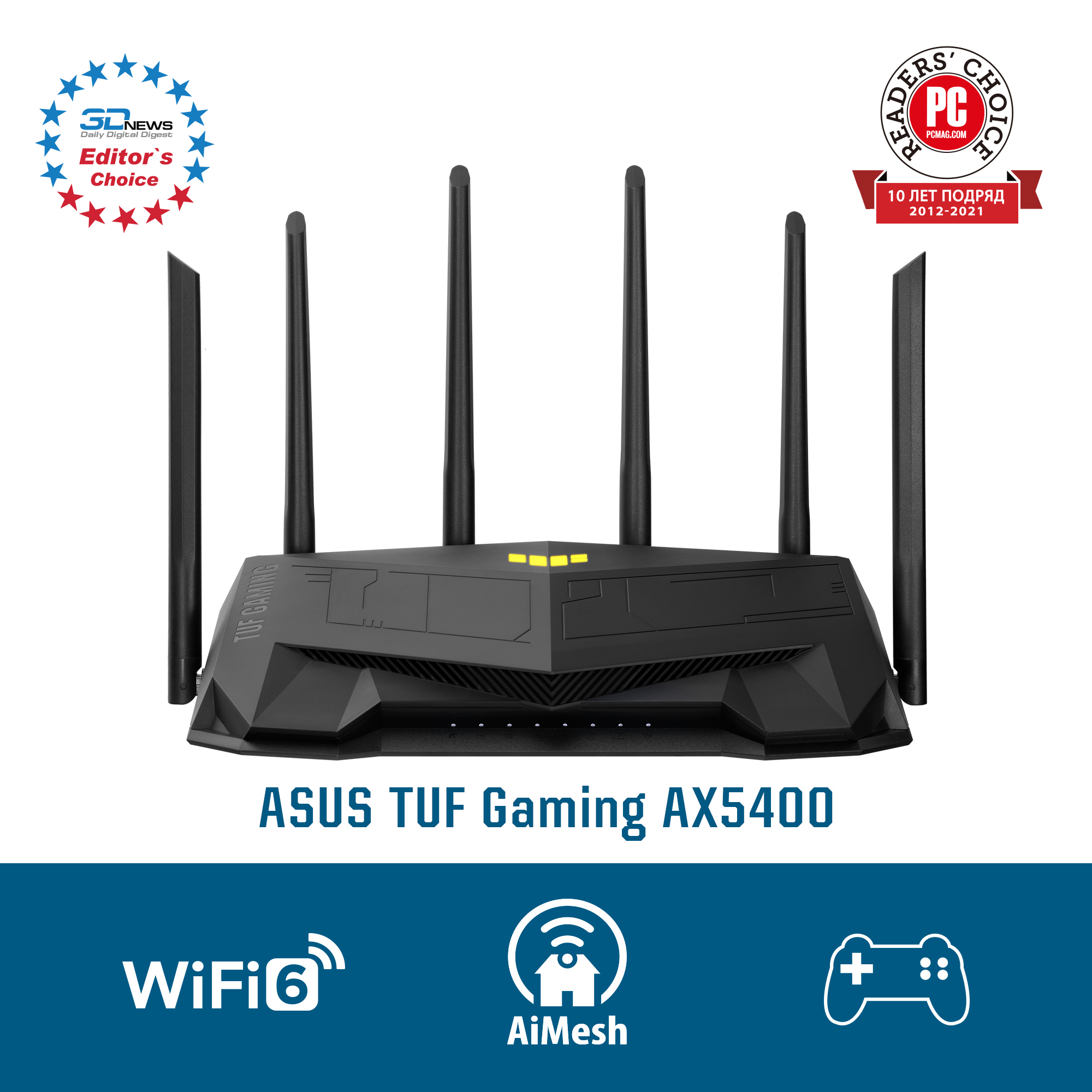 Wi-Fi роутер ASUS TUF-AX5400, 802.11a/b/g/n/ac/ad/ax, 2.4 / 5 ГГц, до 4.8 Гбит/с, LAN 4x1 Гбит/с, WAN 1x1 Гбит/с, внешних антенн: 6, 1xUSB 3.0 (90IG06T0-MO3100/90IG06T0-MU9100), TUF-AX5400