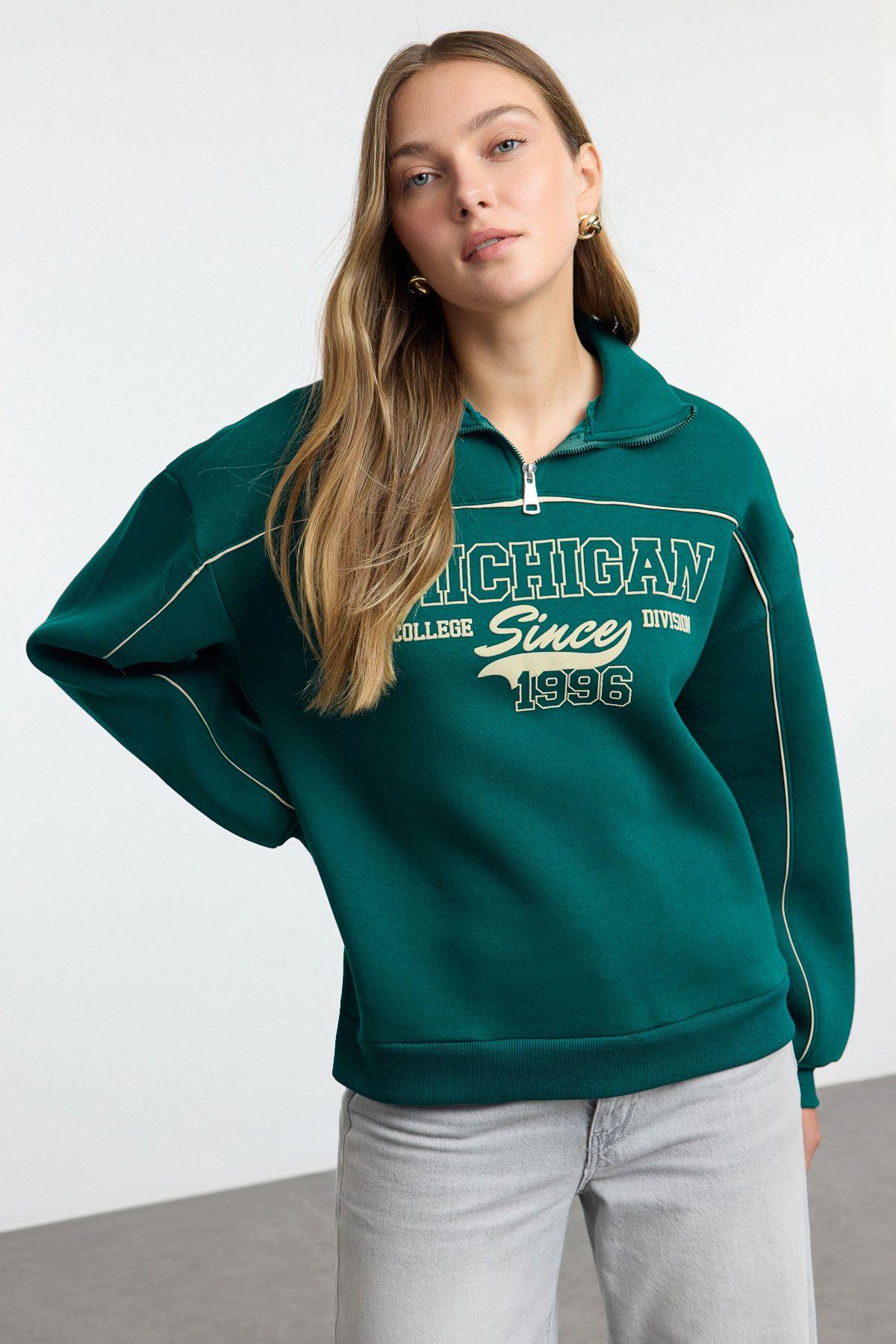 Women s Fashionable Stylish Sweatshirt Emerald Green Zippered Printed Oversize Thick Inside Fleece Knitted Sweatshirt M