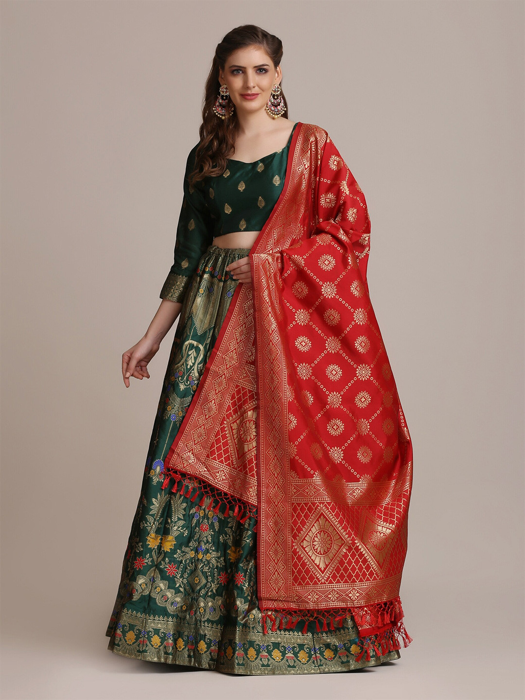 Warthy Ent Green & Red Semi-Stitched Lehenga & Unstitched Blouse With Dupatta