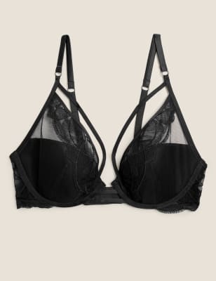 Bold strappy detailing gives a modern look to this bra from our Autograph collection. The plunge design enhances your figure and features supportive underwiring and padding for a smooth look under clothing. Intricate graphic embroidery and branded hardware give a premium finish.nAutograph: refined fabrics and modern silhouettes with feminine embroidery and embellishments.
