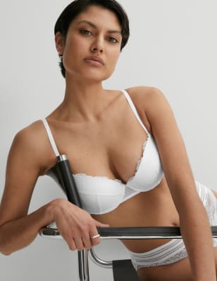 Bring a refined feel to your lingerie drawer with this bra from the Autograph collection. Its underwired cups and balcony style give excellent uplift. The lace overlays are inspired by traditional fan designs and are complemented by ladder-lace trims on the underband. Discreet metallic hardware adds a contemporary finishing touch. Autograph: refined fabrics and modern silhouettes for an effortless, understated style.