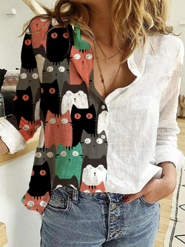 blouses,womens fun cat print color block long sleeve shirt