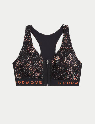 Feel supported during intense gym sessions with this ultimate support sports bra from our Goodmove collection. Coming in a non-wired racer back design, this stylish workout essential features a modern zip fastening on the front and a bold logo underband. Breathable, quick-drying and moisture-wicking fabric, together with our Cool Comfort™ technology, keeps you feeling fresh.