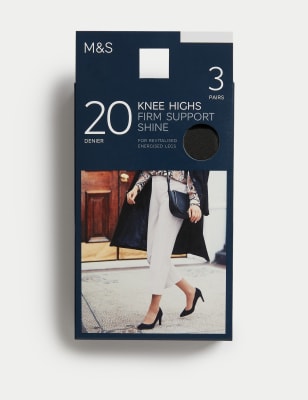 These firm support knee highs improve circulation and reduce ankle swelling for all-day comfort. Handy three-pack, in a sheer 20 denier and a stylish shine finish. Antibacterial Freshfeet™ technology combats the bacteria that cause odours. Complete with flexible added stretch and durable reinforced toes. n M&S Collection: versatile styles in modern shapes with unique and playful details.