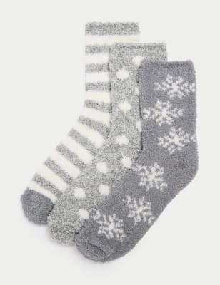 Womens M&S Collection 3pk Cosy Patterned Fluffy Socks - Grey Mix, Grey Mix