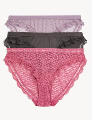 Made with lace and mesh, these knickers are feminine and flirty. Flattering bikini style with added stretch for superb comfort. Repeat 'Love' lettering on the waistband for a fun finish.n M&S Collection: versatile styles in modern shapes with unique and playful details.