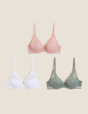 Pretty prints and lace trims give a feminine feel to this pack of three bras. Lower-cut plunge style creates a great natural cleavage for a flattering silhouette. Padded cups offer a smooth look, while underwiring and a comfy elastic underband ensures extra support. Set includes plain mesh, spot print and animal print designs.