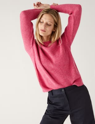 Womens M&S Collection Bequemer Rippenpullover mit Rundhalsausschnitt - Hot Pink, Hot Pink