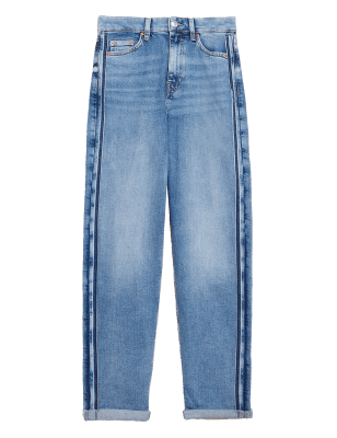 We've trimmed the sides of these jeans with stripes for a dash of detail. They have a cool boyfriend fit, mid-rise waist and rolled ankle grazer hems to create a laid-back look. An authentic wash gives a casual finish. n M&S Collection: easy-to-wear wardrobe staples that combine classic and contemporary styles.